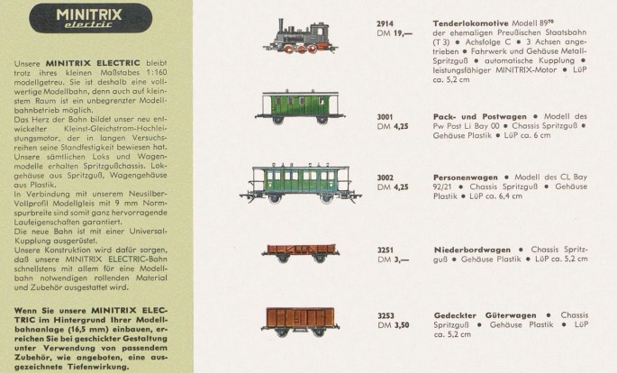 Nach ersten antriebslosen Rollmodellen im Maßstab 1:180, kommt 1964 "MINITRIX electric" auf den Markt, die elektrische Modellbahn für die Spur N im Maßstab 1:160 mit einer Spurweite von 9 mm.